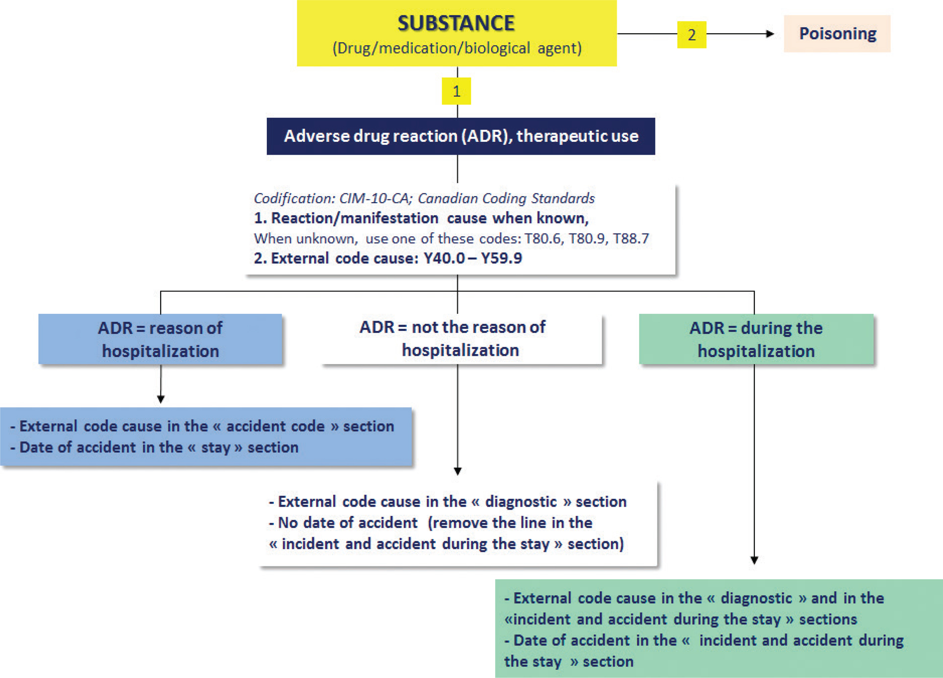In our health facility, a collaborative process involving the medical records and pharmacy departments was set up in 2017 (4). When a patient is discharged, a medical records technician reviews the entire file, including the hospitalization summary sheet, and codes all diagnoses and medical procedures performed during the stay (5). The diagnoses are coded according to the International Statistical Classification of Diseases and Related Health Problems, 10th Revision, Canada (ICD-10-CA), and interventions are coded according to the Canadian Classification of Health Interventions (6). Coding of the summary sheet makes it possible to identify ADRs on the basis of their clinical manifestations and to associate these manifestations with a particular drug or class of drugs (7). Previous work has highlighted the need to reconcile coding data for patients’ hospital stays, as generated by medical records technicians, to improve the detection and reporting of ADRs (4).