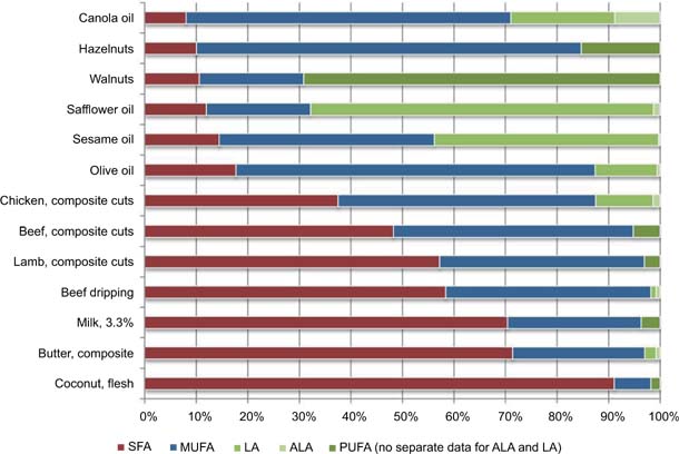 FIG 1. Fatty acid profiles of dietary fat present in selected foods. SFA: saturated fatty acids; MUFA: monounsaturated fatty acids; LA: linoleic acid; ALA: α-linolenic acid; PUFA: polyunsaturated fatty acids. Note: where separate data for ALA and LA was available it was used, otherwise total PUFA was used. With friendly permission of the New Zealand Nutrition Foundation.
