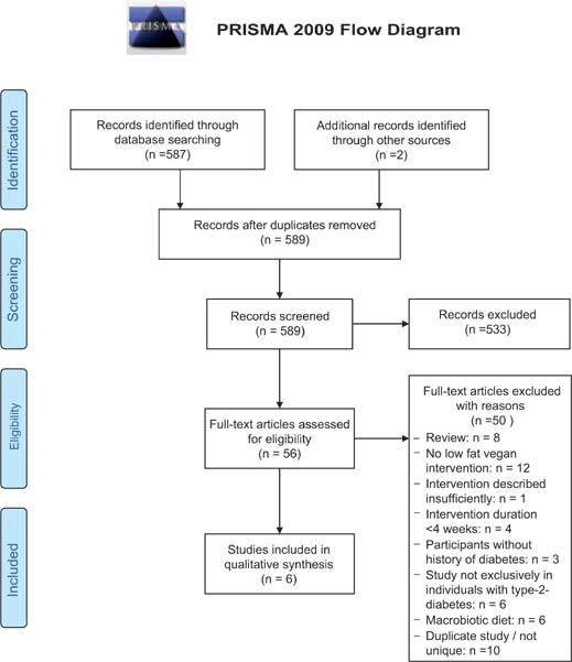 Studies were included when they reported upon a low-fat vegan dietary intervention in individuals suffering from type-2-diabetes. Hereby, a low-fat vegan diet was defined by a (planned) macronutrient distribution of approximately 75% of energy from carbohydrates, 15% from protein, and 10% from fat. Only studies with a minimum duration of 4 weeks were included. Furthermore, studies were also included in this review when the dietary intervention was combined with other lifestyle modifications, for example, meditation, exercising, or behavior therapy.