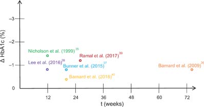 As shown in Figure 4, hemoglobin A1c, a long-term-marker for glycemic control,47,48 also improved significantly across studies. The most pronounced reductions were observed in studies by Nicholson et al.35 and Ramal et al.39 (Figure 4). In 2016, Lee et al.38 reported a mean HbA1c reduction of 0.9% (±0.8) in those patients with high compliance. A comparable reduction (–0.82%) was observed earlier by Barnard et al.36 among medication-stable participants in the vegan group after 74 weeks. In another study by the same group, a low-fat vegan intervention lead to a smaller HbA1c reduction (–0.4%). It must be noted, however, that median HbA1c values were below 7.0% in the intervention group at baseline in this study, which may have limited the potential for further reductions.