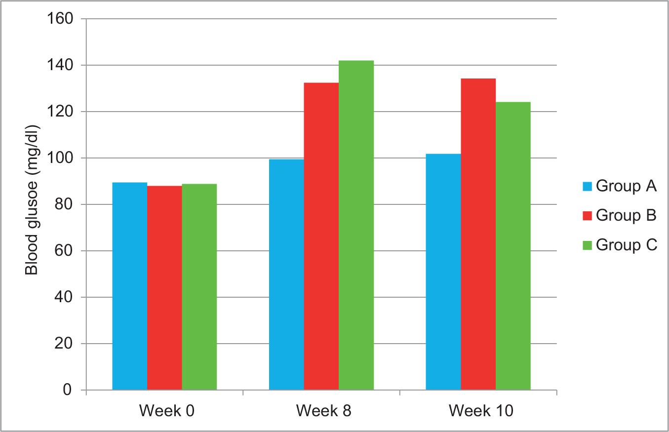 At week 10, blood glucose level was significantly decreased in Group C in comparison with week 8 (p-value of 0.042), while in Group B, blood glucose level was significantly increased than week 8 (p-value of 0.001). Moreover, no significant difference was noticed between 8th and 10th week regarding blood glucose level in Group A (p-value of 0.334) (Figure 1).