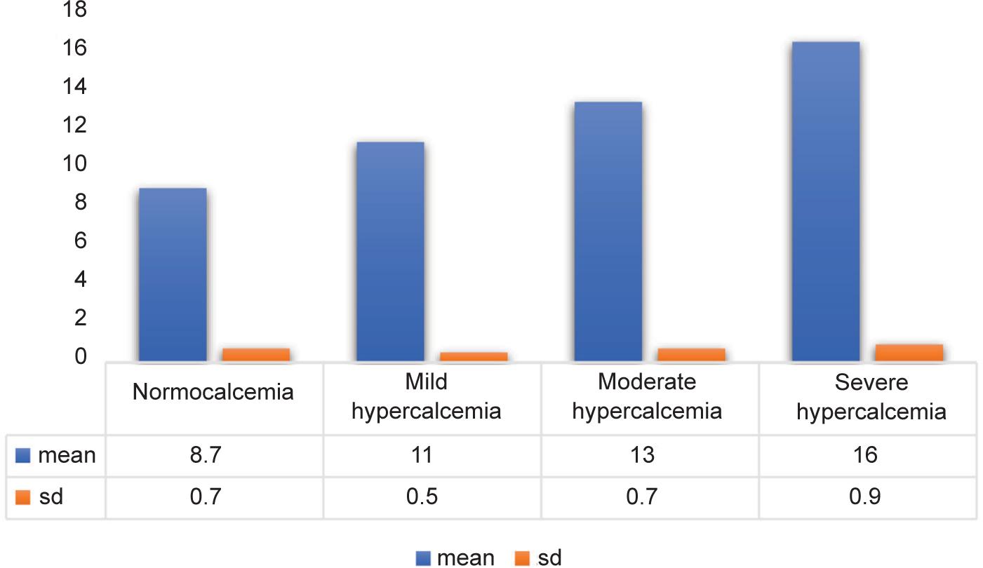 Mean ± SD of patients according to a concentration of calcium in the blood, which included normocalcemia mean (8.7) SD (0.7), mild hypercalcemia means (11) SD (0.5), moderate hypercalcemia means (13) SD (0.7), and severe hypercalcemia mean 16 and SD (0.9), is shown in Figure 1.