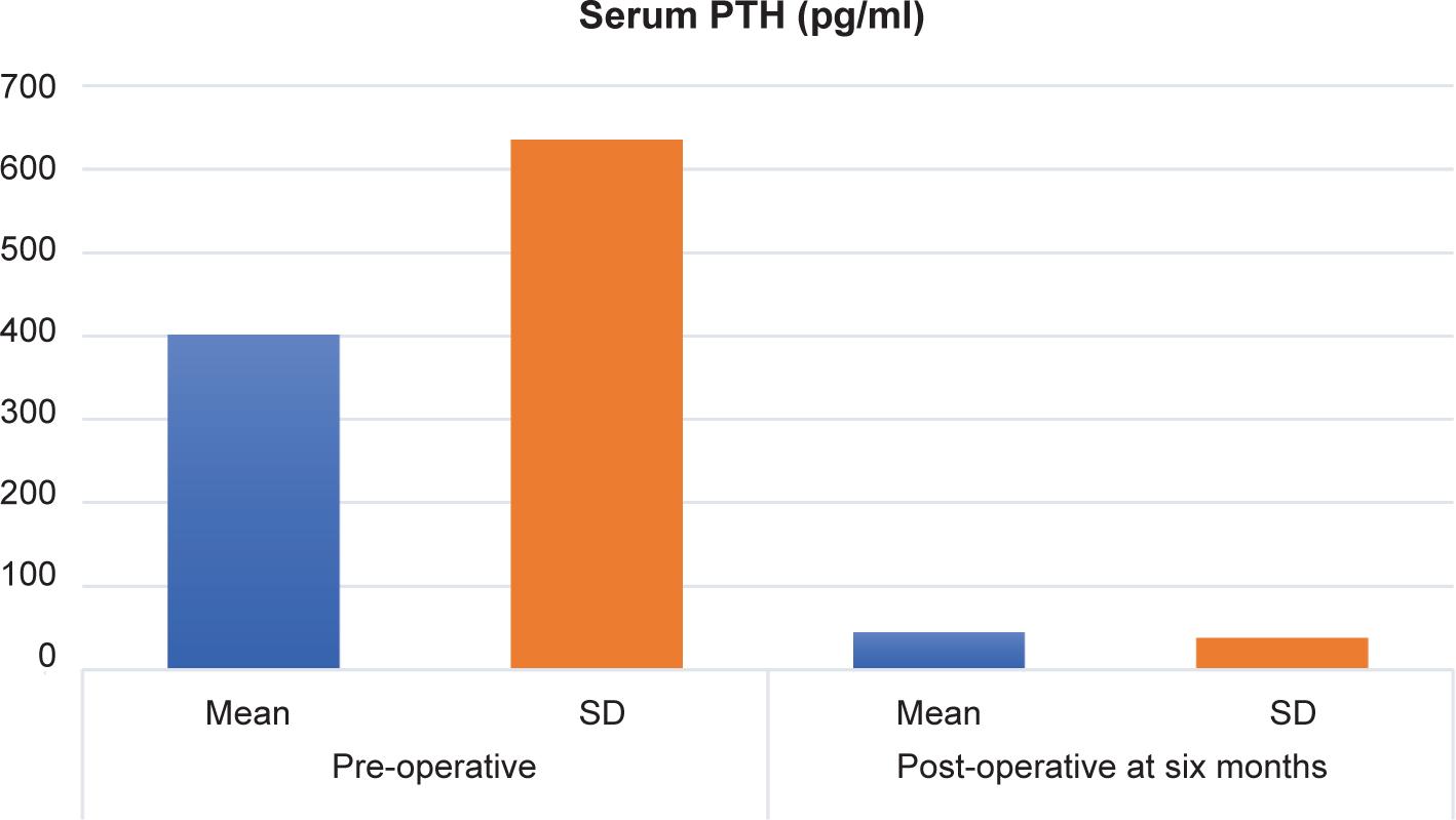 FIG 3. Serum parathyroid hormone pre- and postoperative 6 months after parathyroidectomy.