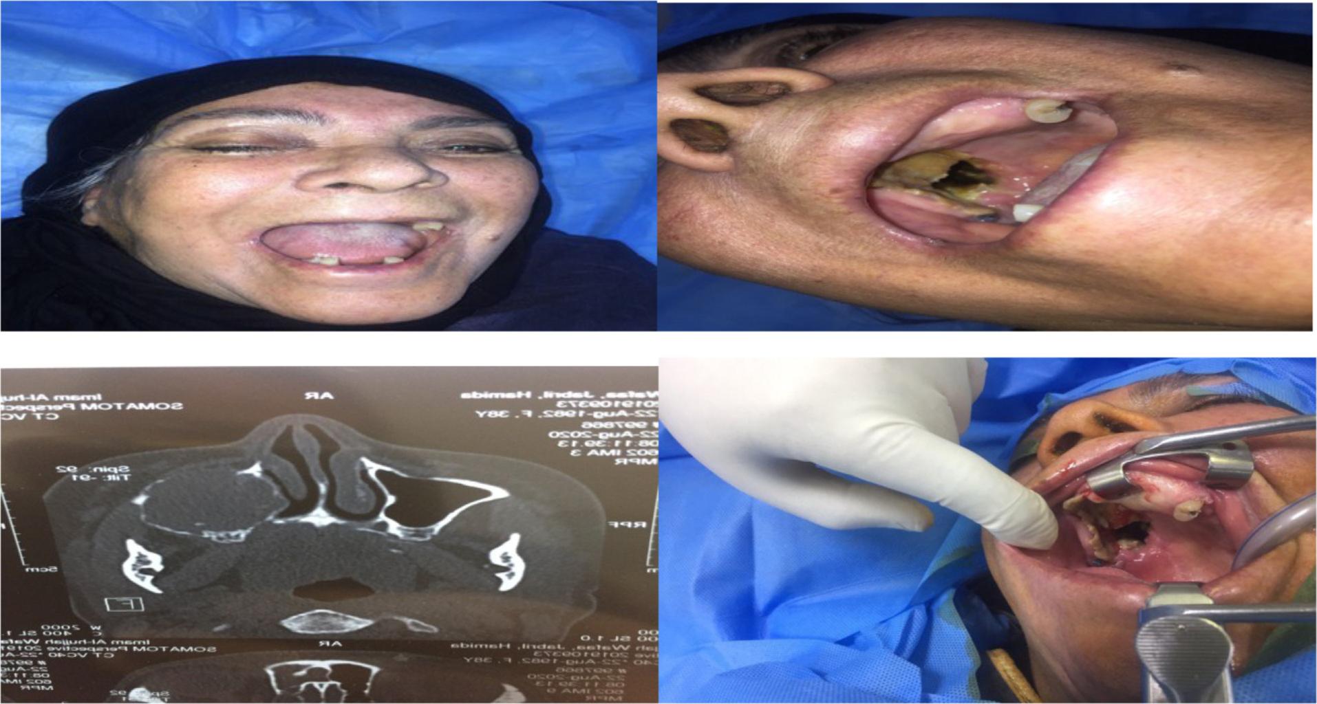 64-years-old female patient with destructive palate and orbital extension as shown by clinical presentations and computed tomography.
