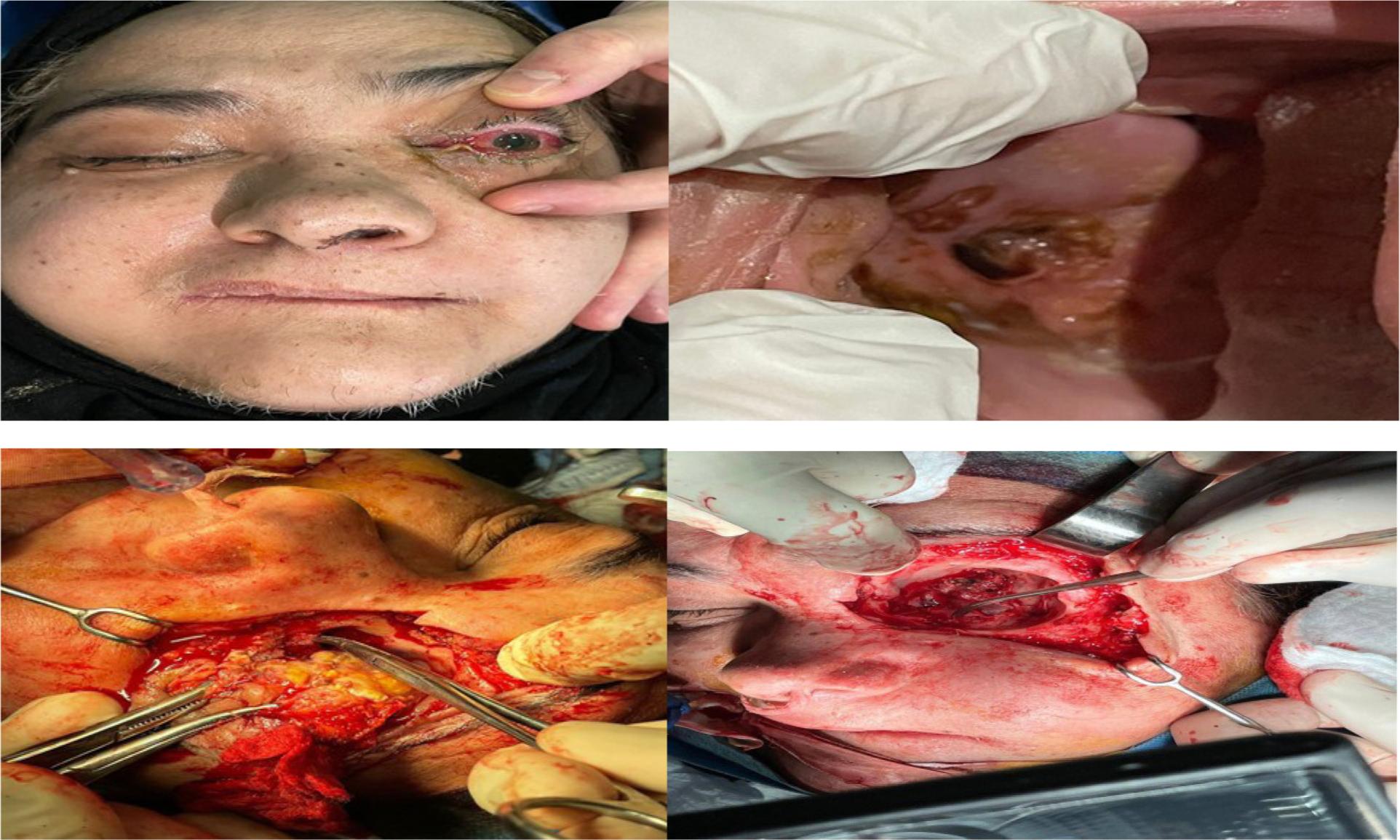 Extensive surgical debridement for the emoval of all necrotic tissues that involve fungal infection, which included (alveolar process with teeth resection, Cald well-Luc approach in maxillary sinus involvement, palatal resection by open maxillectomy, partial maxillectomy to total maxillectomy, resection facial skin and muscles, and orbital exenteration). Images from the CT and/or MRI helped in defining the extent of surgery. Extension of surgical detriment was determined by MDT (Figure 2).