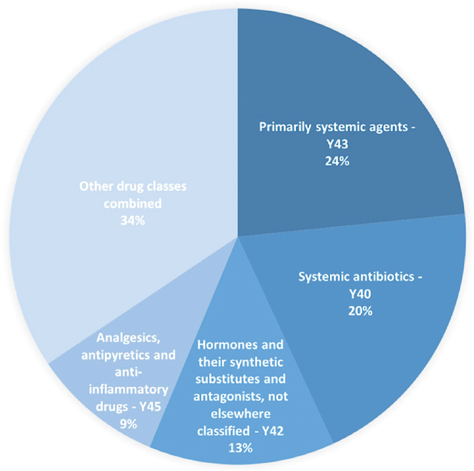 Of the ADRs analyzed, 23.4% (177/755) were associated with the Y43 class (primarily systemic agents), 19.7% (149/755) with the Y40 class (systemic antibiotics), 13.2% (100/755) with the Y42 class (hormones and their synthetic substitutes and antagonists, not elsewhere classified), 9.3% (70/755) with the Y45 class (analgesics, antipyretics, and anti-inflammatory drugs) and 34.4% (259/755) with all other drug classes combined. Figure 1 presents the profile of all ADRs analyzed by classes.