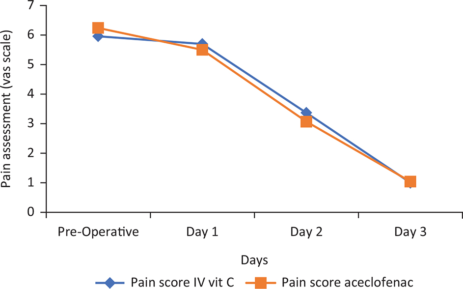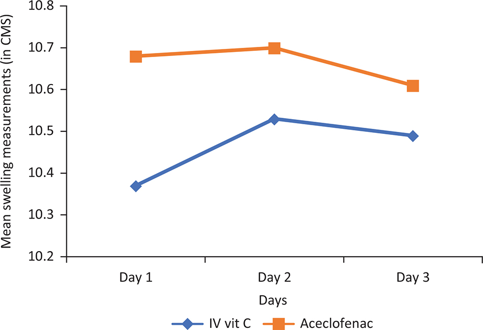 Postoperative swelling or oedema is mainly due to the combined action of inflammatory mediators and also phospholipids released from ruptured cell membranes, which turns into prostaglandins and other metabolites causing pain and swelling.31 Quantifying postoperative oedema accurately is difficult owing to the three-dimensional nature with an irregular, convex surface.32 In this study, measurement of the swelling was recorded both anteroposteriorly and superoinferiorly. Due to diffusion of swelling in different planes, the examiner of study felt difficult to measure accurately, and therefore, measurements were made in triplicate and their average was recorded. It was noted that postoperative swelling (anteroposteriorly) reduced in both groups with increase in postsurgical period from day 1 to day 3. Statistically significant difference was observed for IV vitamin C group (p<0.05). Superoinferiorly, no statistically significant difference was observed in both groups (p>0.05).