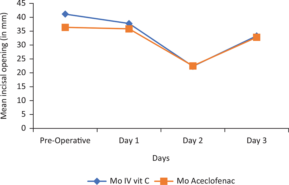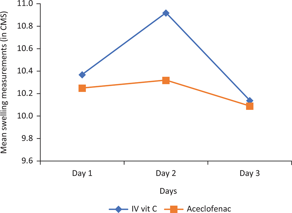From the results, we observed that the reduction of mouth opening was seen in both treatment groups. This was particularly marked on the second postoperative day. The difference in the mean interincisal distance between the treatment groups was not statistically significant (p>0.05) in the postoperative period, that is, day 1, day 2 and day 3, respectively. Similar pattern of reduction in mouth opening on day 1 following surgery and further improvement on day 5 were observed in the group treated with aceclofenac in the study conducted by Yasin and Tawfiq.30 Similar to pain intensity, both IV vitamin C and aceclofenac have performed similarly for the treatment of trismus/mouth opening with significant improvement of the same in the postoperative period.