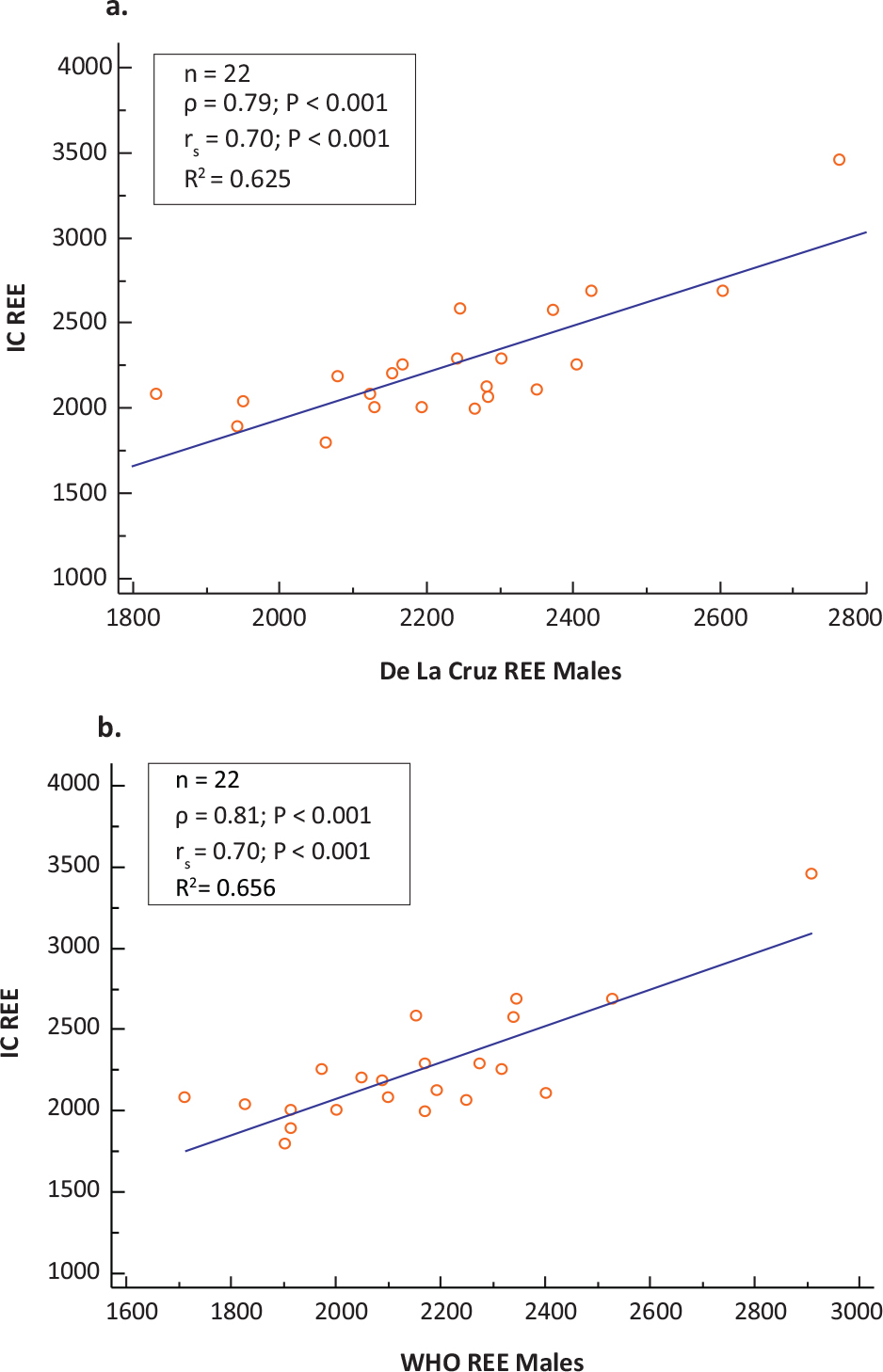 FIG 1. Scatter Plots and Correlation coefficients (ρ =Pearson’s coefficient; rs =Spearman’s Rank Order Coefficient) of Measured Versus Predicted REE Using (a) IC and the De La Cruz and (b) IC and WHO Equations in Males (n = 22).
