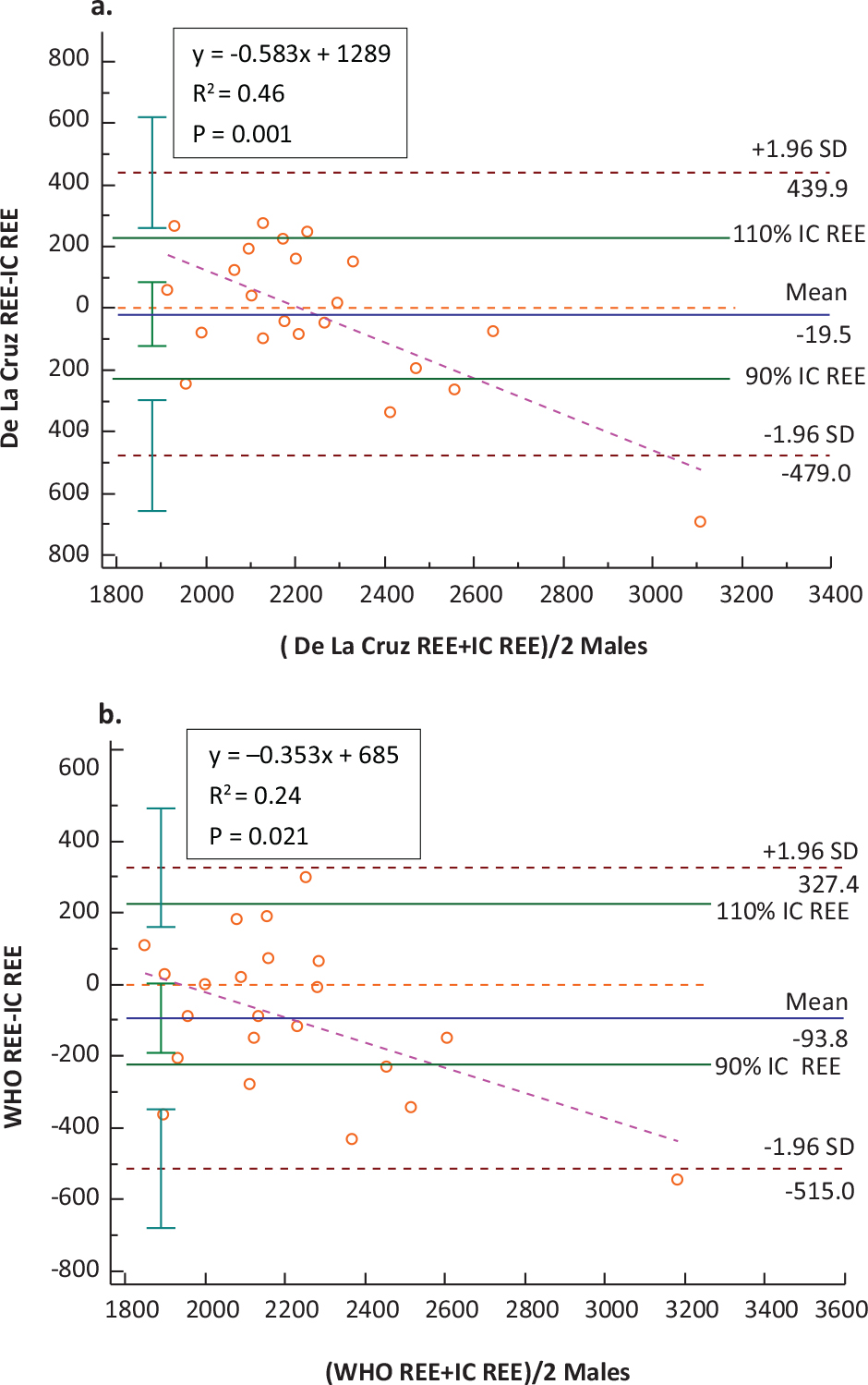 FIG 2. Bland–Altman Plot: Differences in the Measurements of REE Using (a) IC and the De La Cruz and (b) IC and WHO Equations in Males (n = 22).