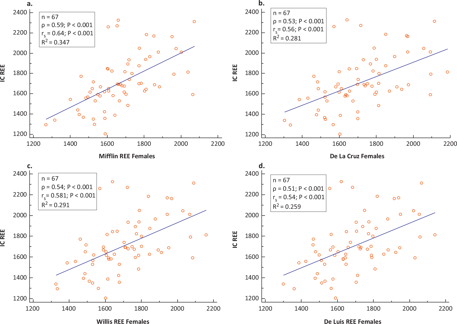 FIG 3. Scatter Plots and Correlation coefficients (ρ =Pearson’s coefficient; rs =Spearman’s Rank Order Coefficient) of Measured Versus Predicted REE in (a) IC and Mifflin, (b) IC and De La Cruz, (c) IC and Willis and (d) IC and De Luis Equations in Females (n = 67).