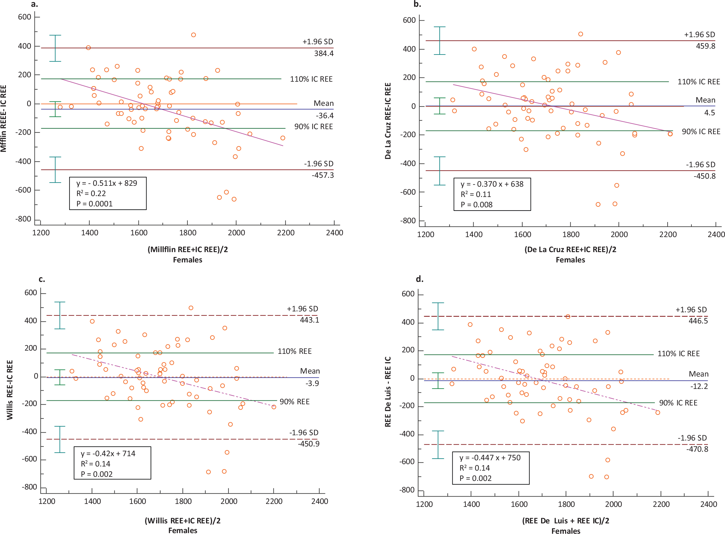 FIG 4. Bland–Altman Plots: Differences in the Measurements of REE Using: (a) IC and Mifflin, (b) IC and De La Cruz, (c) IC and Willis and (d) IC and De Luis Equations in Females (n = 67).