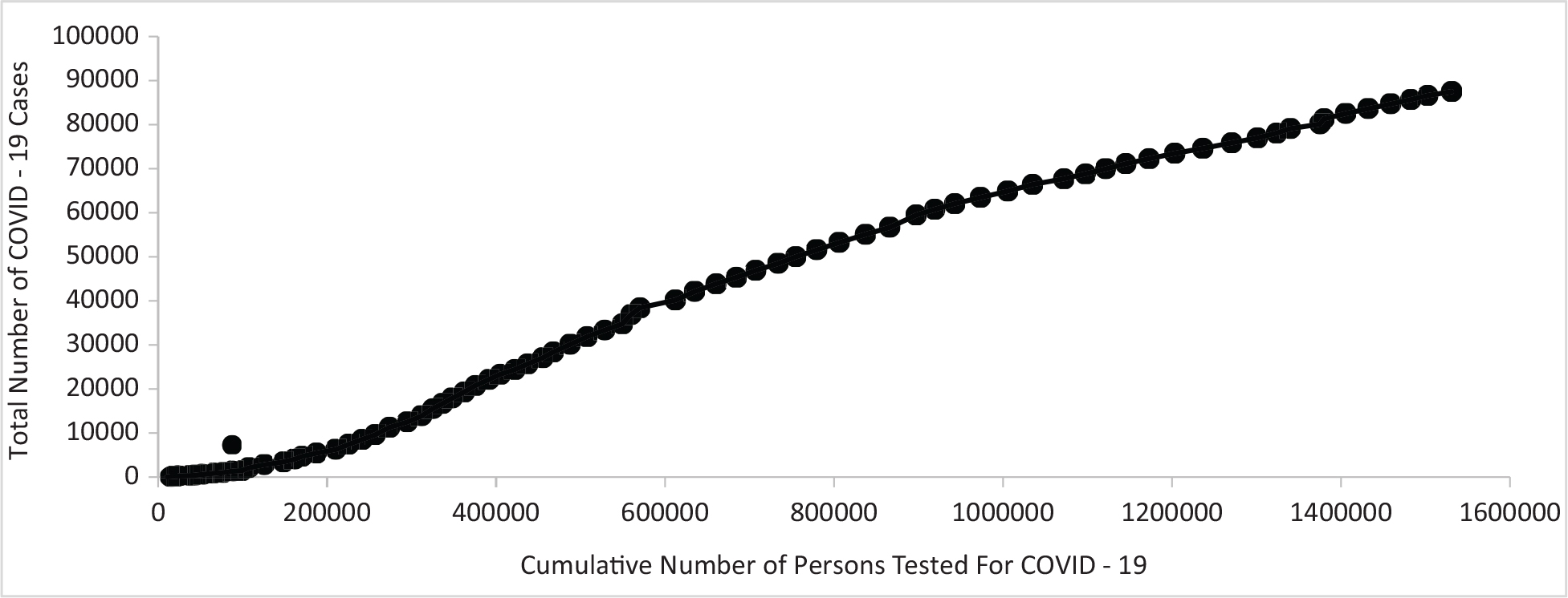 FIG 1. An Example: Proportion of Persons with a Positive COVID-19 Test to the Cumulative Number of Persons Tested for COVID-19 from March 11, 2020, to May 27, 2020, in Canada.