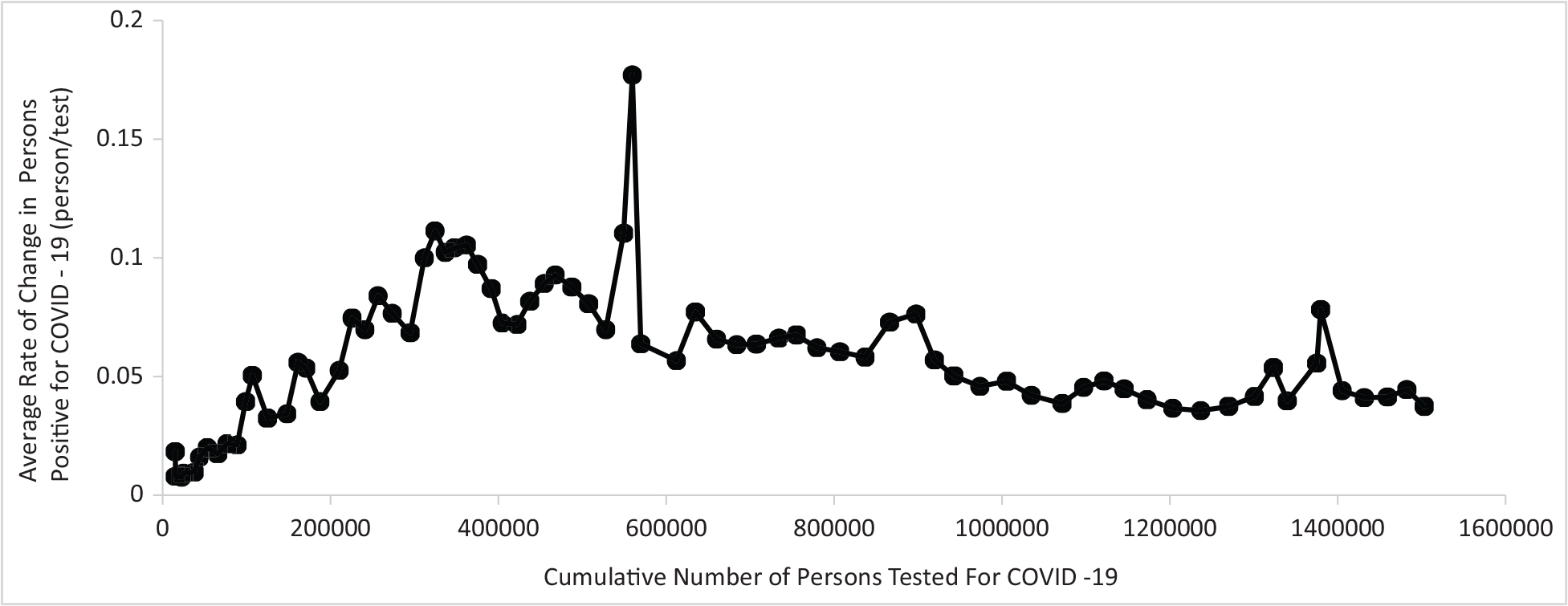 Furthermore, cities or provinces may also calculate the derivative of this curve, which can help to differentiate between exponential and linear increase, a template shown in Figure 2. The derivative in Figure 2 was calculated by determining the change in number of persons who tested positive for COVID-19 divided by the change in the number of tests conducted in Canada, prior and subsequent to every data point. The significance of finding the derivative is to quantify the rate of change in day-to-day cases, whether it is increasing, decreasing, or remaining constant. For example, the spike at approximately 600,000 tests was correlated to one of the highest increases in daily cases in Ontario, Quebec, and Canada as a whole, relative to the number of tests conducted. These increases were attributed to the increase in cases in nursing and long-term care homes, as well as the peak of community spread in Ontario. Overall, the end of the pandemic or first wave in any region will arrive when the line in Figure 2 approaches 0.