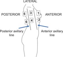FIG 1. Areas to be examined using lung ultrasound. Each hemithorax is subdivided into six areas by the anterior and posteior axillary lines.