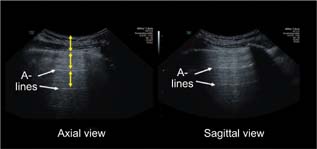 A-lines (Figure 4): these appear as motionless and regularly spaced horizontal lines under the pleural line. These correspond to normal reverberation artefact of the pleural line. A-lines and lung sliding define normal aeration.62