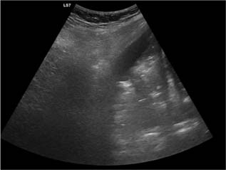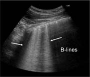 Coalescent B-lines (white lung; Figure 7): B-lines may amalgamate, giving the image of “coalescent” B-lines arising from the pleura and spreading to the edge of the screen, denoting more severe lung edema.