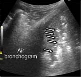 Air bronchogram (Figure 9): sometimes, hyperechoic punctiform images may be seen within the consolidation corresponding to the air-filled bronchi. This is also called air bronchograms. During inspiration, these hyperechoic punctiform images may be reinforced due to penetration of gas into the bronchial tree of the consolidation (the so-called dynamic bronchogram).