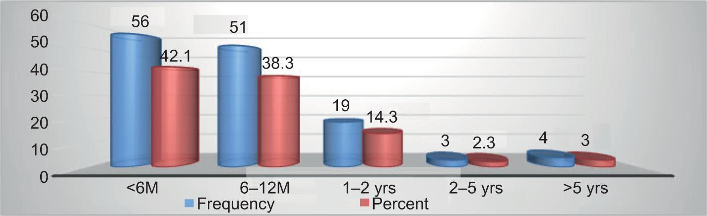 Regarding the Sociodemographic characteristics of the study group, a total number of 133 cauterized children had been included in this descriptive cross-sectional study with a mean age of 9.25 ± 11.5 months with male to female ratio 1:0.72.