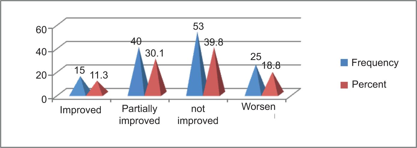 Most of the cauterized patients were not improved or their condition worsened (58.6%), whereas only 11% showed improvement, and this result coincides with the results from other studies like those done in Oman in which improvement was seen in only a small percentage, and also supported what has been found in studies from Libya and Sudan.3,22-4 This small percentage of improvement after cautery may be attributed to the self-limited course of some diseases or the effect of the treatment, which was taken before the cautery.