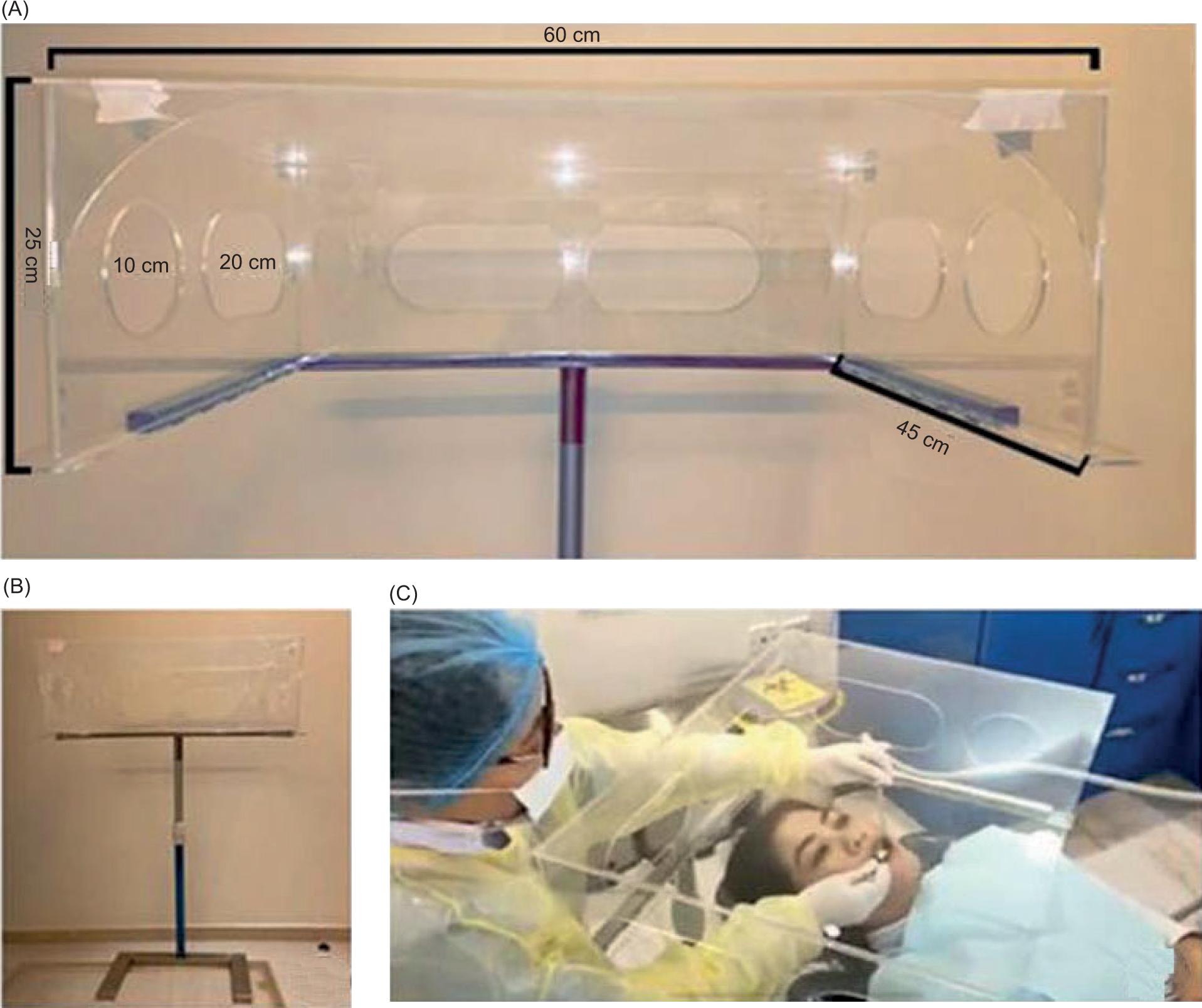 FIGURE 1. Aerosol box (Dentist’s Shield) reformed design (A), adjusted to the dental chair with a stand (B), and demonstration of patient accessibility in dental operatory (C).